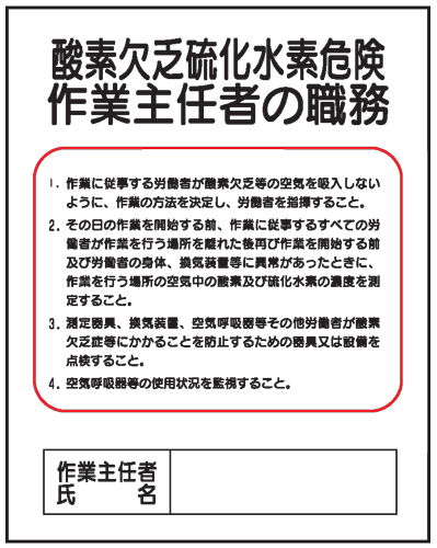 クリーンエコボード標識!酸素欠乏硫化水素危険作業主任者の職務J5(B) 500×400 価格: 630円レビュー評価: 0.0レビュー数:0 労働安全衛生法に基づく労働安全衛生規則第2章・第5節・第18条 『事業者は、作業主任者を選任したときは、当該作業主任者の氏名及びその者に行なわせる 事項を作業場の見やすい箇所に掲示する等により関係労働者に周知させなければならない。』 ● 作業主任者の職務を明示する 法令表示板です! ● 4スミ穴を利用で様々な場所に取付可能。 クリーンエコボード製品です。 (再生ポリプロピレンを 使用したリサイクル素材) 作業主任者の職務標識 J5(B) 表示酸素欠乏硫化水素危険 作業主任者の職務 サイズ500×400×1mm厚 4スミ穴材質クリーンエコボード ● 再生ポリプロピレン Supported by 楽天ウェブサービス |